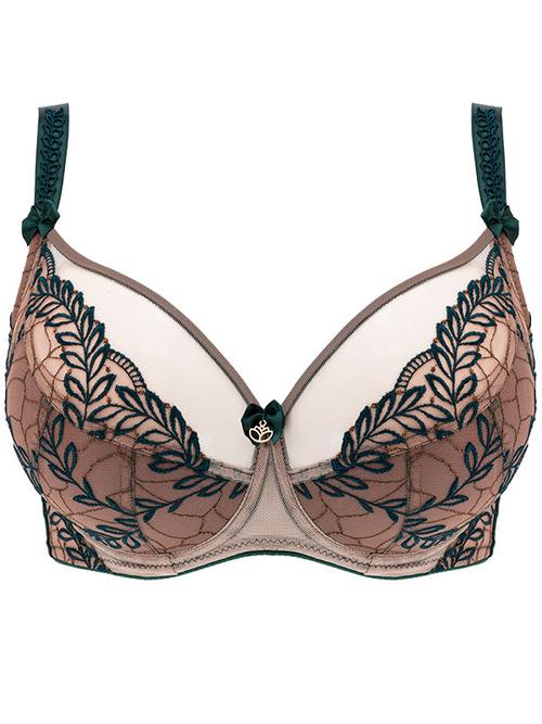 Model Adore to charakterystyczny wzór zielonych gałązek na tle brązowego tła dodatkowo rozświetlonego złotymi nićmi. Delikatne ozdoby na ramiączkach oraz pomiędzy miseczkami, stanowią dodatkowy atut w tym biustonoszu.