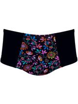 Strój plażowy Nan to feeria radosnych barw, które przybrały kształt kwiatów i motywów roślinnych. Połączenie z klasyczną czernią nadaje całości charakteru i elegancji. Figi typu maxi posiadają wysoki stan, dzięki czemu mogą tuszować ewentualnie niedoskonałości ciała, jednocześnie doskonale kształtując sylwetkę.