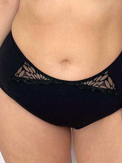 Te zdobione z przodu elastycznym haftem figi wykonane zostały z mikrofibry ciętej laserowo (bezszwowe nogawki z tyłu). Figi te modelują sylwetkę ze względu na zastosowanie elastycznych materiałów i zabudowany krój. Środek wykończony bawełną dla większego komfortu użytkowania.