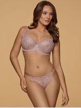 Subtelna elegancja najlepiej definiuje model Quinn – to flagowy model z wiosennej kolekcji, utrzymany w zgaszonym różu i wzbogacony dyskretnym złotem. Przygotowany na bazie delikatnego tiulu, podkreślając sensualność i lekkość, otula ciało niczym druga skóra. Mieniące nici i detale dodają wyrafinowanego blasku, tworząc idealną harmonię.
