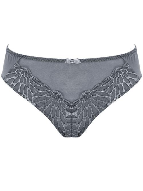 Figi typu tanga wykonane zostały z oddychającej mikrofibry, półprzezroczystego tiulu i elastycznego haftu. Tył wykonany z delikatnego tiulu łączonego pośrodku fig, dzięki czemu nie odznaczają się pod ubraniem. Kroczek od środka podszyty został bawełną dla lepszego komfortu użytkowania.